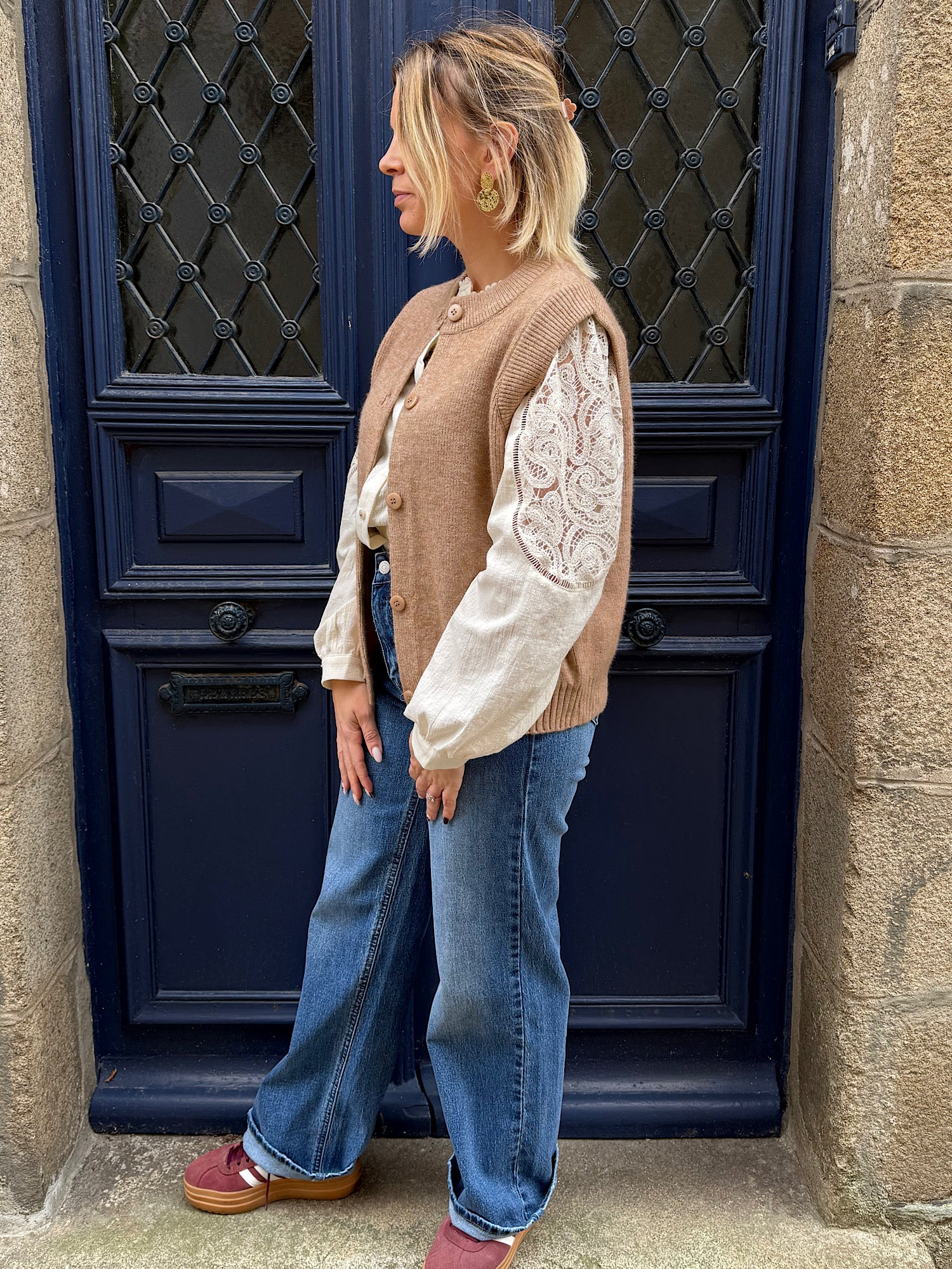 Complétez votre look avec le gilet Farah Taupe et le jean Leslie