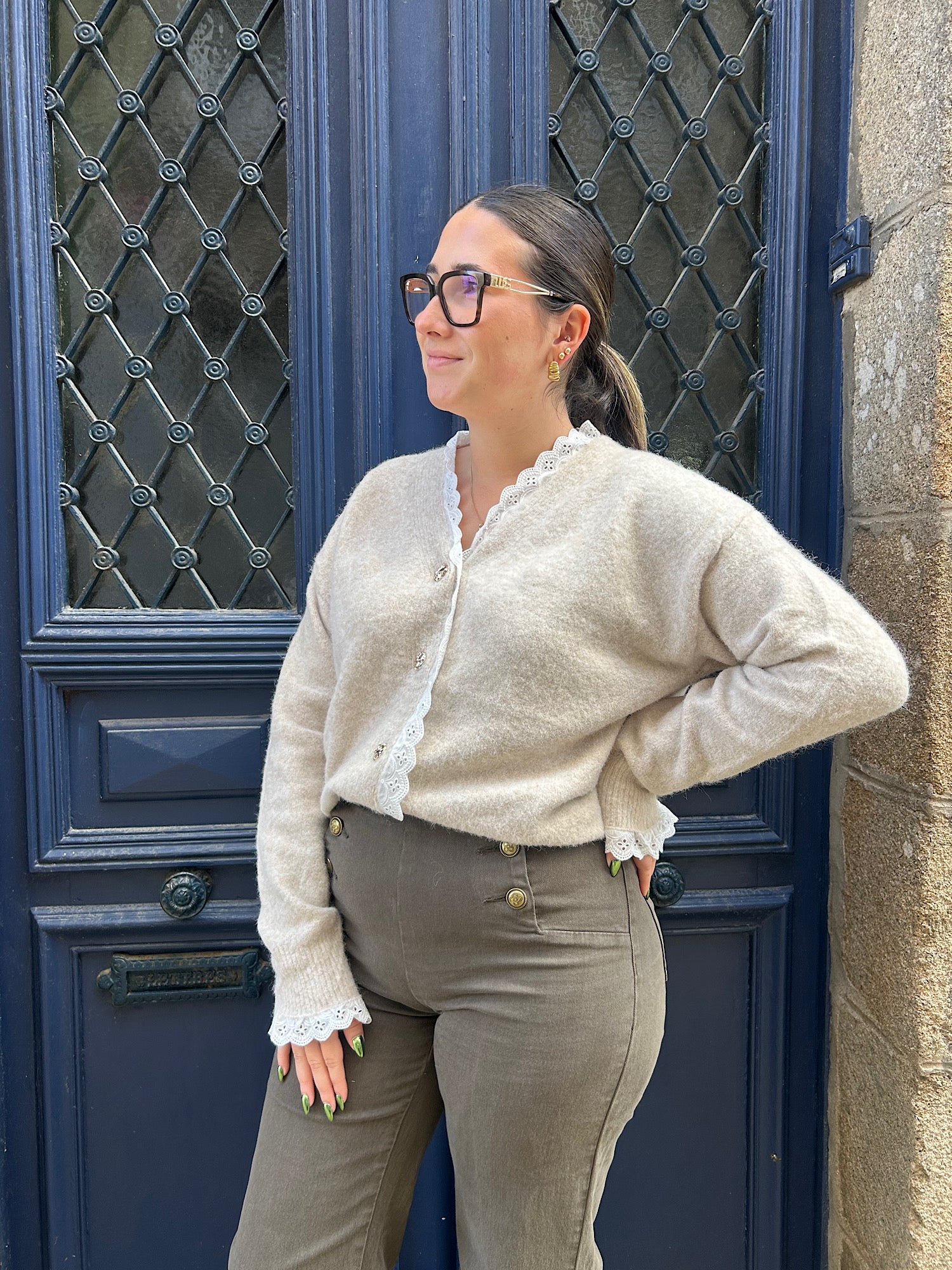 Détail dentelle le long de la boutonnière et aux manches