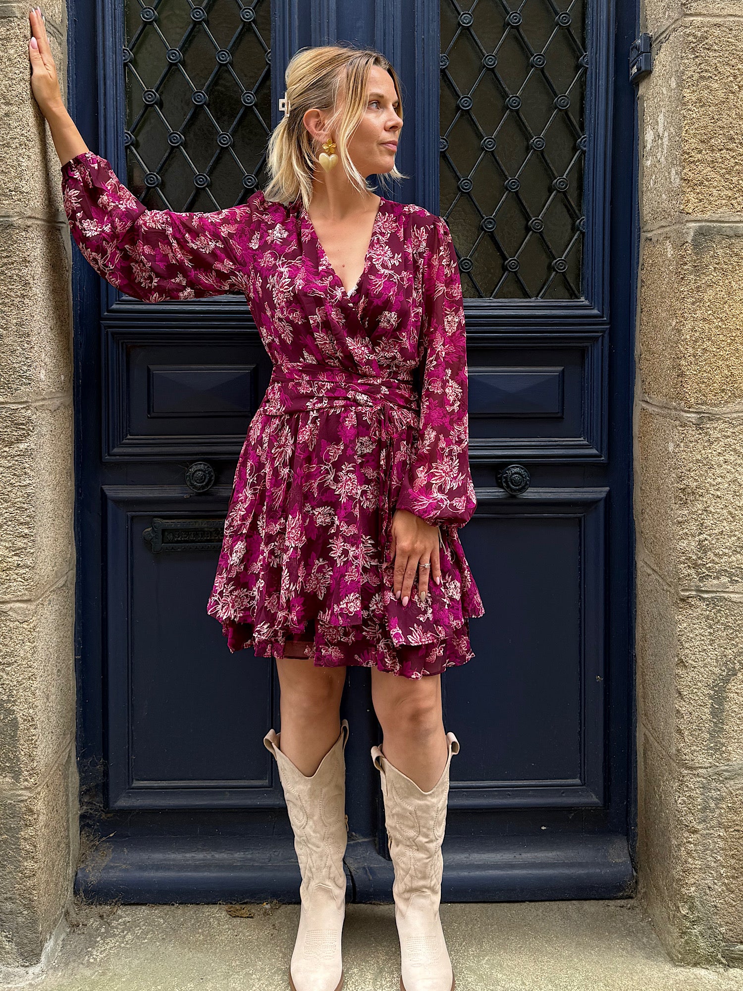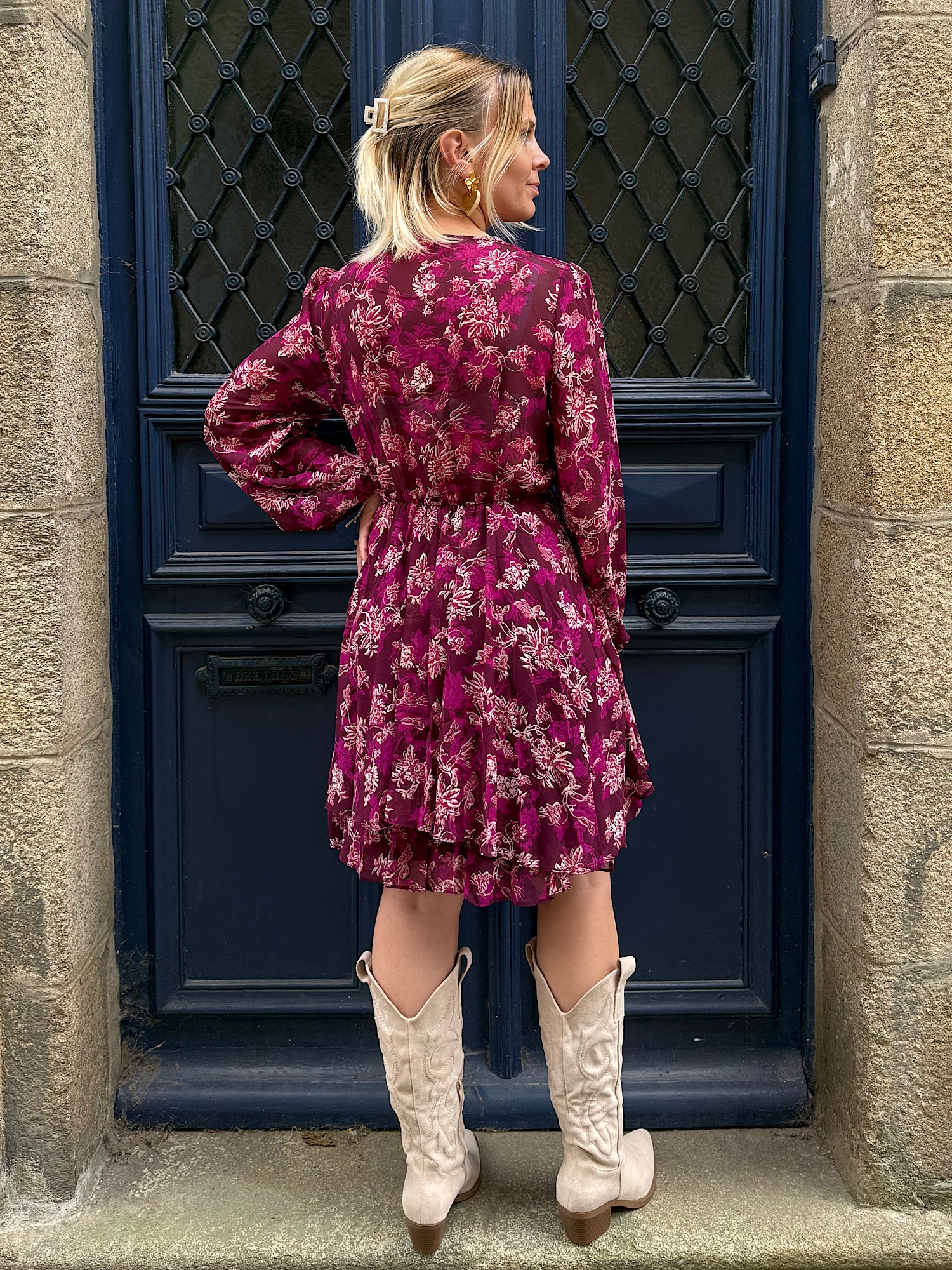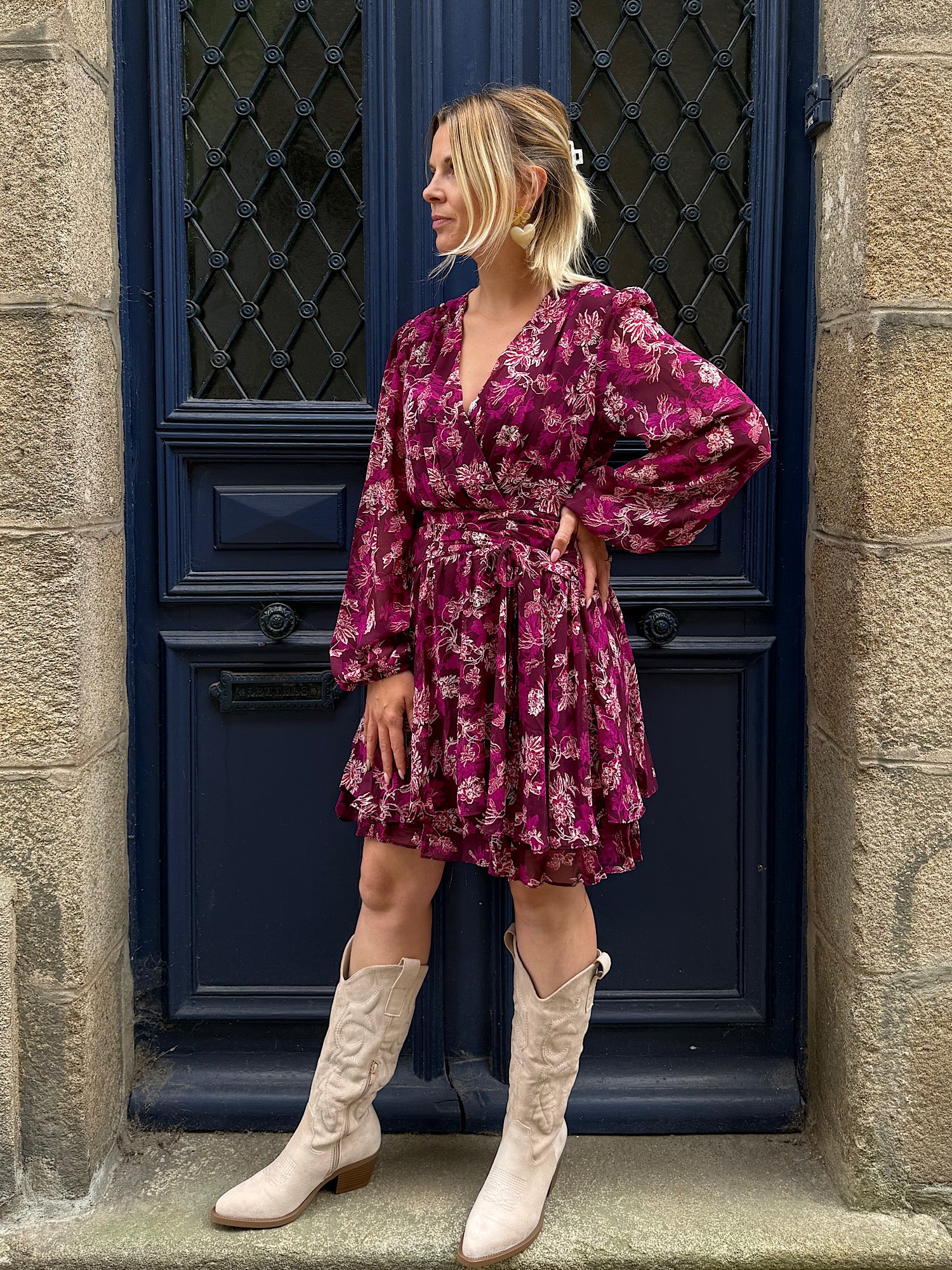 Imprimé fleuri beige et violet sur fond prune